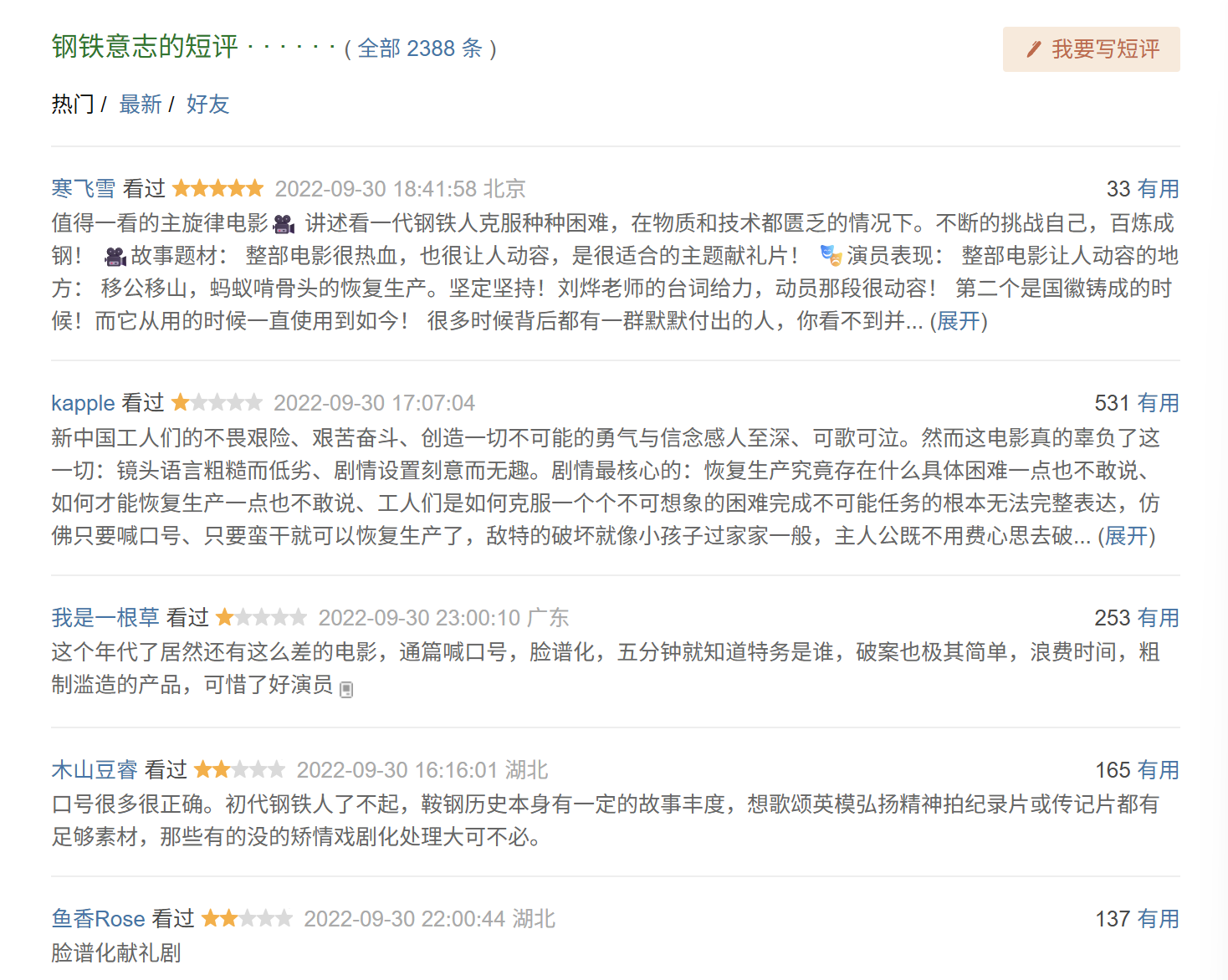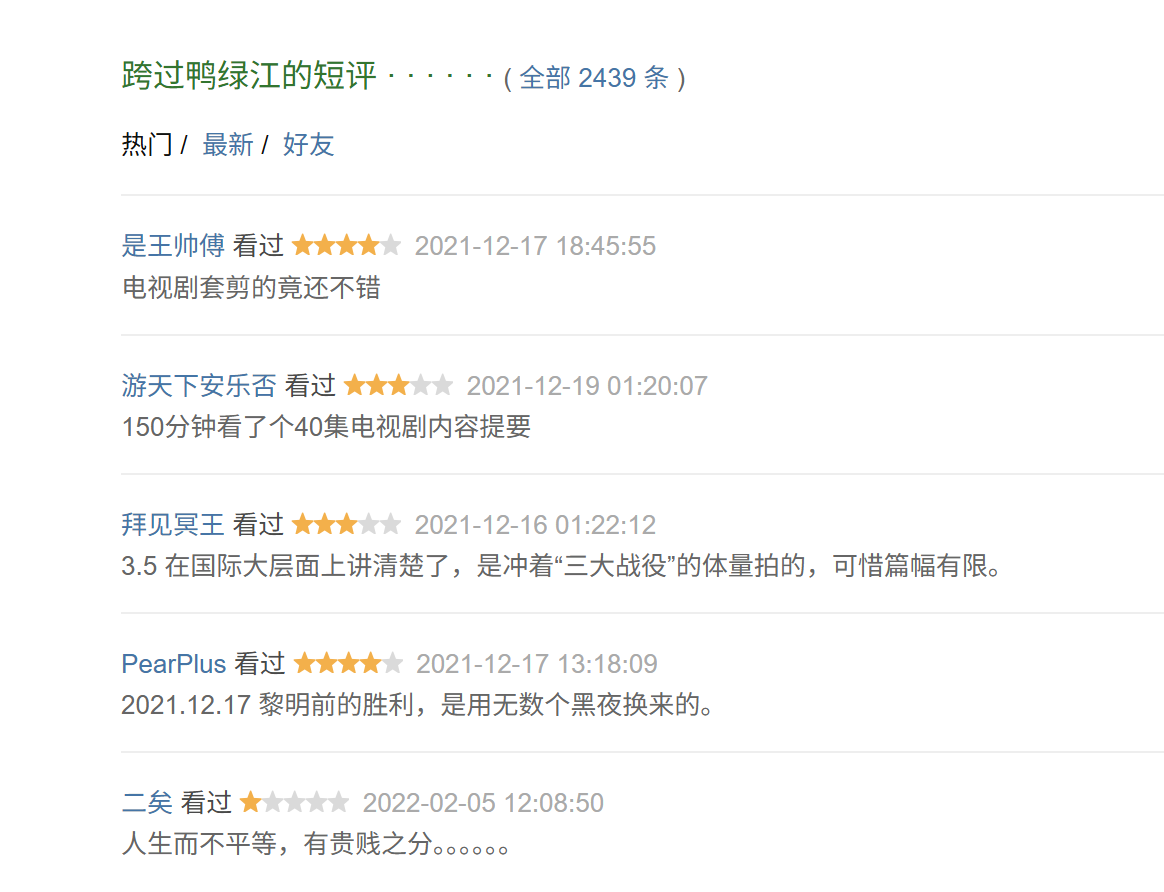《钢铁意志》没开分,但没有关闭网友评价,豆瓣首页五条短评,有四条差评。