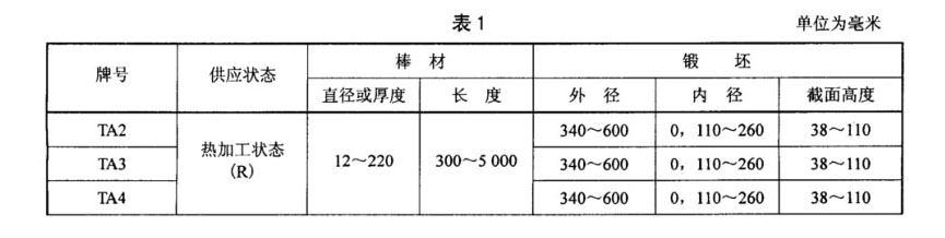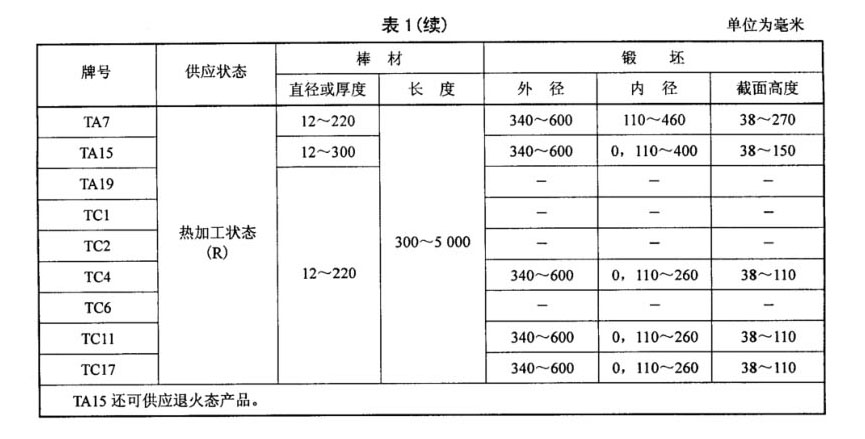 棒材和鍛坯牌號、狀態(tài)和規(guī)格應(yīng)符合表1的規(guī)定。其中TA15鈦合金棒材根據(jù)用途分為兩個類別: