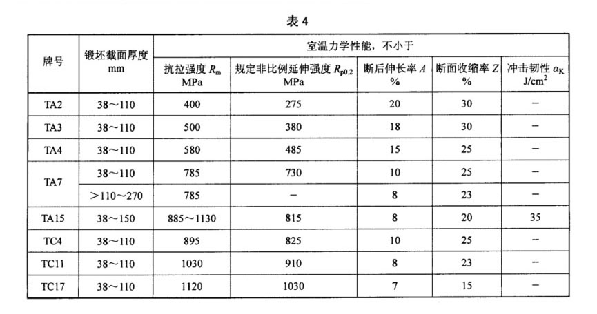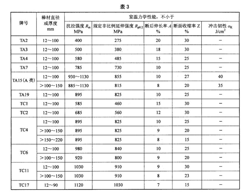 3.4.2 棒材的室溫力學(xué)性能應(yīng)符合表3的規(guī)定,鍛坯的室溫力學(xué)性能應(yīng)符合表4的規(guī)定,超出表中規(guī)格范圍的棒材或鍛坯的室溫力學(xué)性能由雙方協(xié)商確定。