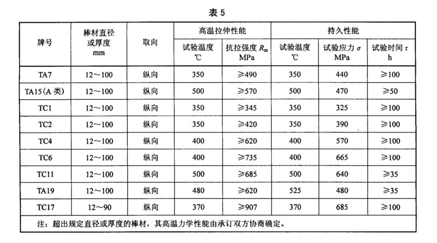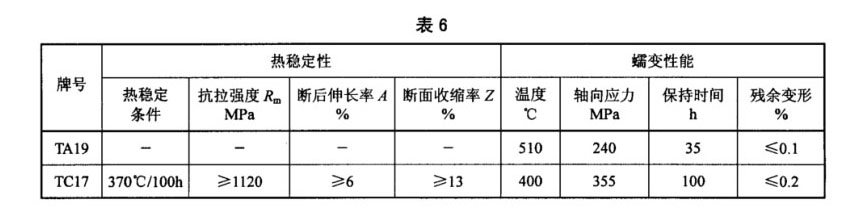 3.4.3 訂購方要求并在合同中注明時,鈦合金棒材的高溫拉伸、持久性能應(yīng)符合表5的規(guī)定,TA19和TC17鈦合金棒材的熱穩(wěn)定性和高溫蠕變性能應(yīng)符合表6的規(guī)定。