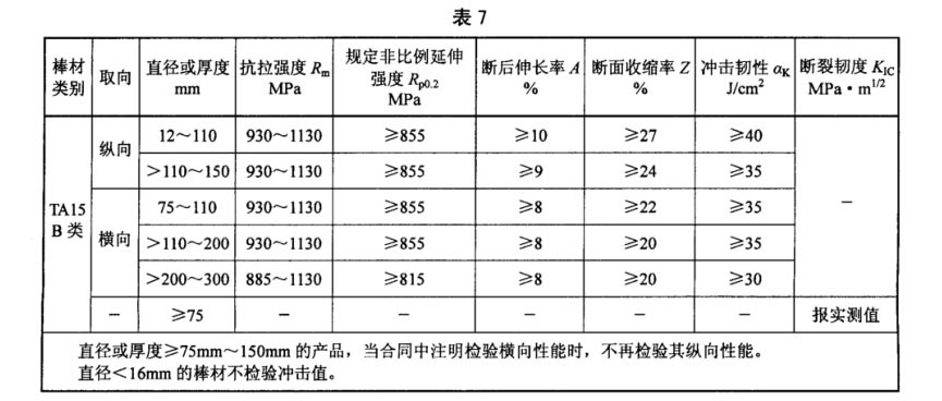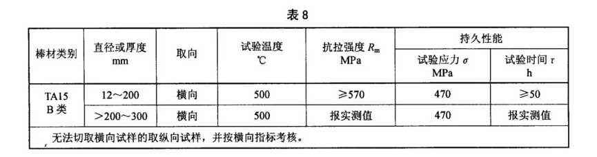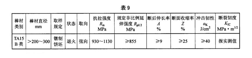 3.4.4 B類用途的TA15鈦合金棒材,其室溫力學(xué)性能在退火態(tài)棒材上或經(jīng)熱處理后的棒坯(一段棒材)上取樣測試。其室溫力學(xué)性能應(yīng)符合表7的規(guī)定,高溫力學(xué)性能應(yīng)符合表8的規(guī)定;當(dāng)訂購方要求并在合同中注明時,直徑大于200mm的棒材應(yīng)取樣鐓制餅坯,餅坯的室溫力學(xué)性能應(yīng)符合表9的規(guī)定。