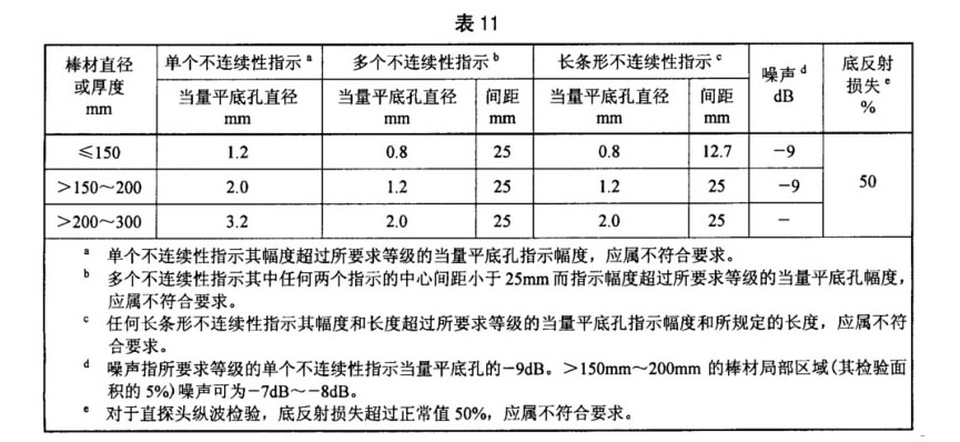 3.6.2 B類用途的TA15鈦合金棒材,應(yīng)按本規(guī)范的附錄A進行徑向縱波、周向橫波檢驗。徑向縱波檢驗允許的缺陷當(dāng)量值見表11,周向橫波檢驗不允許存在任何超過人工傷反射幅度的信號。