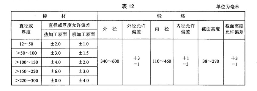 3.7.1 棒材和鍛坯以磨削或機加工表面供貨。當(dāng)訂購方要求并在合同中注明時,棒材也可以熱加工表面供貨。棒材和鍛坯的尺寸允許偏差應(yīng)符合表12的規(guī)定。