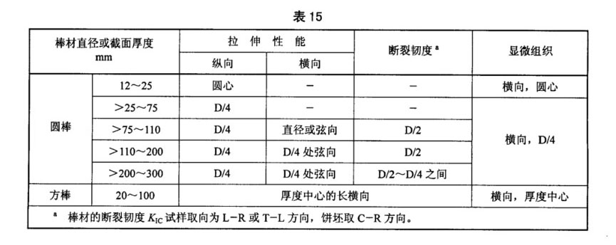 4.2.2.3 B類用途TA15鈦合金棒材的取樣位置還應(yīng)符合表15的規(guī)定,直徑大于200mm的棒材當(dāng)訂購方要求并在合同中注明進行鐓制餅坯檢驗時,從每根受檢棒材上截取長度為60mm±3mm的毛坯。